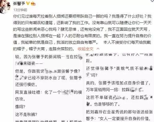 虽然此前也扒过张馨予的各种黑料,坐台啦、果照啦、勾引导演啦……不过这次发表的言论居然有种积极向上好青年的感觉…娱乐圈里鱼龙混杂,谁都不好评断谁到底是什么样的人。