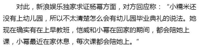 消息曝出之后,有责任的媒体还是第一时间向杨幂方面求证,求证后才知道原来小糯米确实还没有上学,现在只是上了早教班对小糯米进行早教,而小糯米所在的早教班也压根没有毕业典礼一说。
