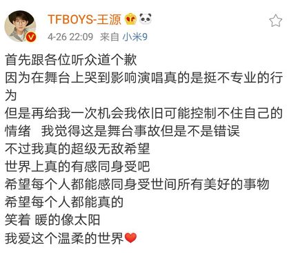 节目播出后王源在微博发文道歉,自己的表现挺不专业的,对不起观众。但是再来一次,可能还是控制不住情绪。