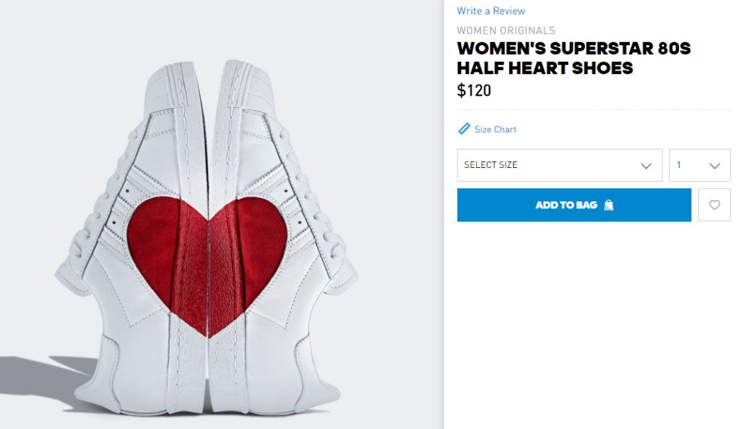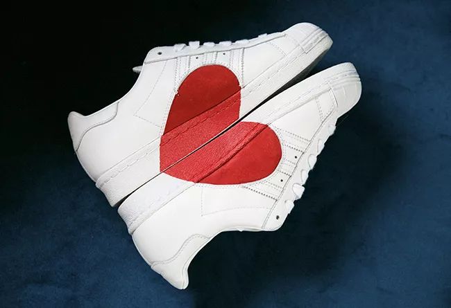 同样的“爱心拼合”设计在SUPERSTAR 80S 的经典小白鞋上,更是让人眼前一亮。小白鞋从外侧看起来依旧是简约大方,而鞋子的内侧却隐藏着半个爱心图案,可谓是创意十足。