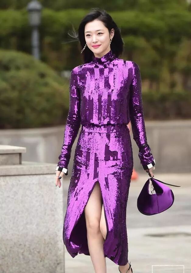 就连莲娜丽姿的紫色亮片连衣裙,“从头闪到脚”的这种礼裙,我们雪莉穿起来也不比模特差!