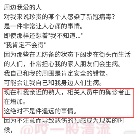 他说因为身边的人有确诊的病例,所以让他知道这并不是遥远的事情,看到很多人还对此不当回事,他出于担心而开了这样的玩笑。
