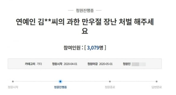 金在中的行为在韩国引发了众怒,不到一个小时的时间里就有超过三千人在青瓦台网站参加请愿要求处罚金在中。