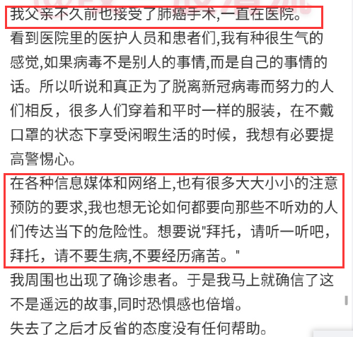 他再次表示自己是因为担忧由于春天到来,大家对疫情情况有所松懈,再加上父亲患了肺癌,而对生命更加珍视,所以想要用这种方式提醒大家。
