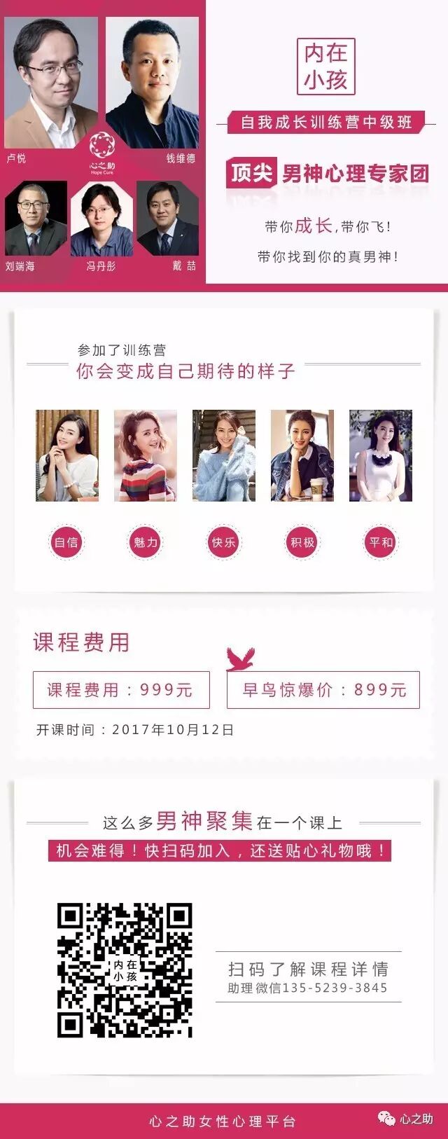 PPS:小伙伴们,《内在小孩自我成长训练营中级班》开始招募啦,找对人带我们成长会事半功倍!报名加入我们,开启心灵的全新蜕变。