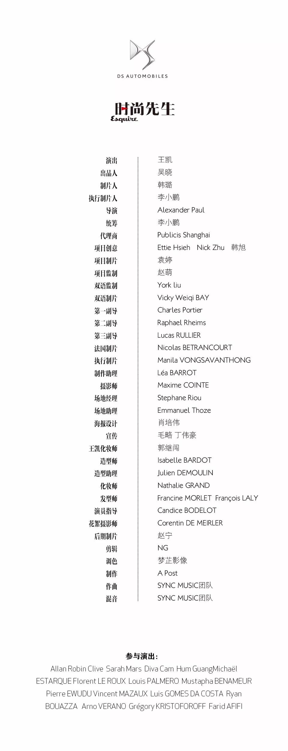 出道至今,王凯饰演过千差万别的角色。但在微电影《巴黎之光》中,王凯是首次挑战007式的智勇绅士特工。温文儒雅的他,穿上利落的西装,驾驶着DS 7,风驰电掣地穿越巴黎。他嘴角一抹不易察觉的微笑,又或是不经意的一个侧颜杀,似乎都有着让敌人闻风丧胆的魔力。