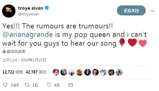 Troye Sivan本人在推特上也证实了合作消息,他写道:是的,传闻是真的,Ariana Grande是我的流行女王,我迫不及待想让你们听到我们合作的新歌。