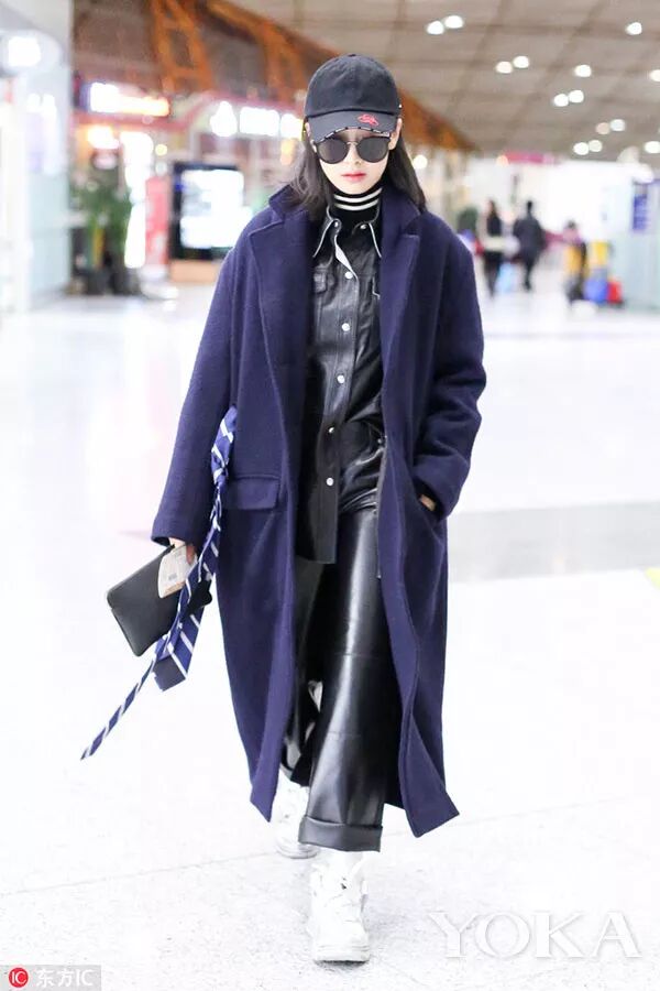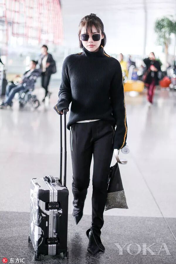 张天爱也是采用掖一个衣服脚的方法,配上一双高跟袜靴,在机场步步生风。