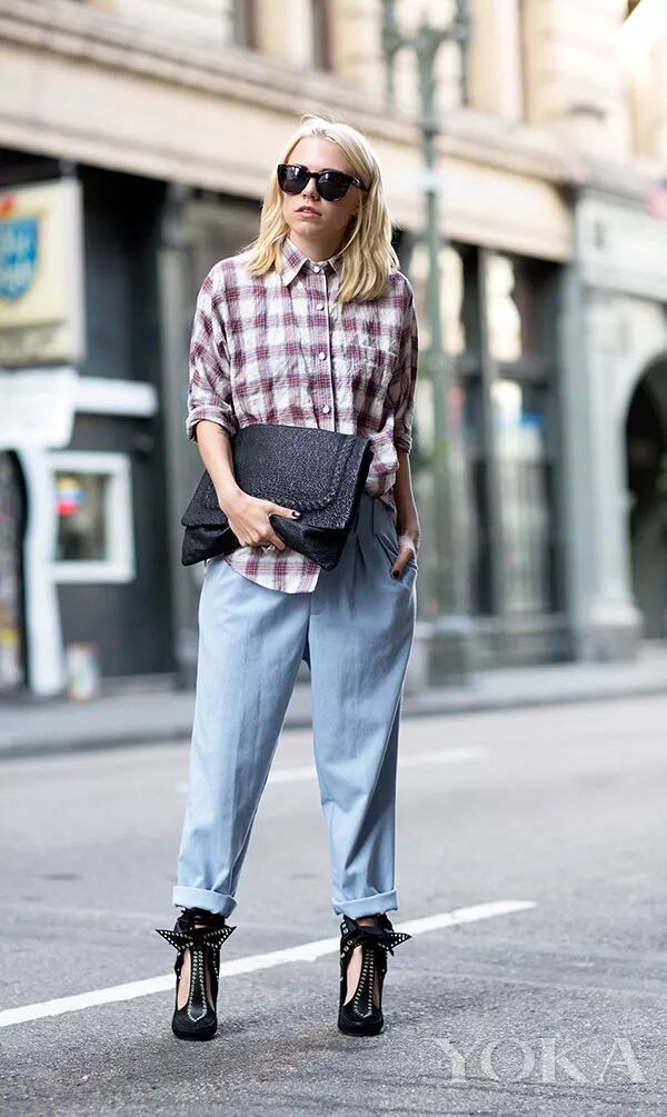 选择裤子的时候,也要注意调整你的比例,尽量不要选择低腰裤。中等高度或者高腰裤最好。
