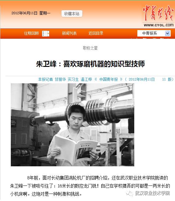 朱卫峰,男,机电工程学院数控技术专业2004届毕业生,武职“朱卫峰工匠工作室”负责人。现任中国长江动力集团技师,他带领班组将数控机床优势发挥到极致,攻克一个又一个制造上的瓶颈,为公司创造了巨大的经济效益和社会效益。曾获“武汉市技术能手”,“武汉市五一劳动奖章”、“湖北省优秀共产党员”、“湖北青年五四奖章”等荣誉。