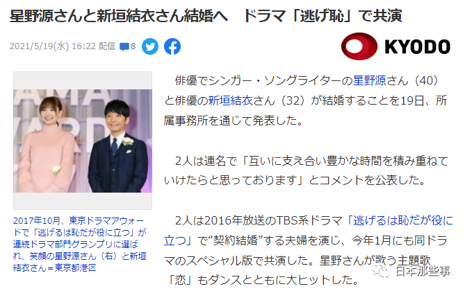 就是去年宣布结婚的“逃耻夫妇”星野源和新垣结衣。
