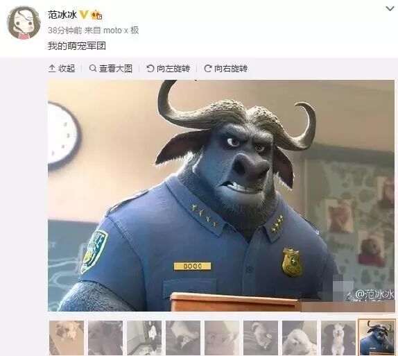 今天,范冰冰更新微博,晒出一组萌宠的照片,有可爱的小狗也有萌萌的小猫,而在最后一张她上传了一张《动物城》中的牛警长暗指男友李晨。范冰冰配文写道“我的萌宠军团”。