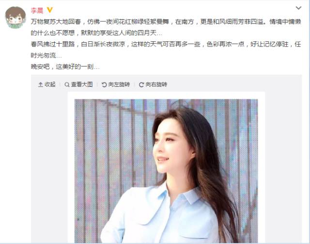 李晨又虐狗了,前几天凌晨,晒出一张范冰冰的近照,照片中的范冰冰大眼闪亮,肤白貌美,俏皮可爱似少女。
