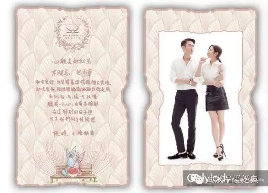 陈晓平时就很喜欢画画,作品曾引得网友直呼“惊艳”,毕业于美国南加州大学的陈妍希在大学期间副修过美术,因此两人的婚礼请柬更像一份认真用心的作品:双“C”logo的设计出自陈晓之手,两个人姓氏的首字母“C”被一颗钻石连接在一起,寓意从此两心相连,心心相印;两只手捧心形花束紧紧依偎的小兔子则是陈妍希亲手画的,兔子是陈晓的属相,两只小兔子在一起温暖甜蜜。