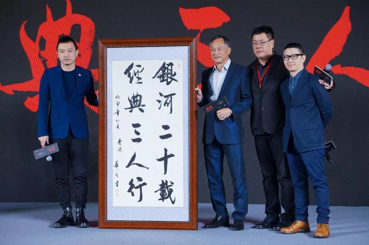 作为"银河二十年"纪念,现场不但以一支展现杜琪峯电影枪声夺人的视频燃爆开场,出品方代表寰亚文化传播(中国)有限公司行政总裁柯上闵和爱奇艺影业(北京)有限公司总裁李岩松更现场为杜琪峯送上"银河二十载经典三人行"题字,题字出自68岁的香港书画大家冯兆华之手,三十年来他为《一代宗师》等70部以上香港电影题写片名,成为香港电影兴衰沉浮的见证者,由他来书写的十个字,对于由杜琪峯、韦家辉、游乃海"铁三角"领军的银河映像来说,更是具有特别的寓意。