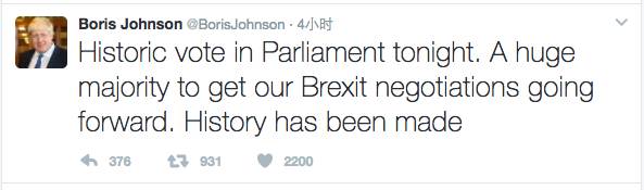 英国外交大臣鲍里斯·约翰逊表示,这是一次历史性投票,压倒性多数通过法案让英国的脱欧谈判迈向前进。