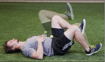 该基础练习有两个重点,一是臀肌,二是核心肌肉。库克式提髋能够发展臀肌和腘绳肌的力量,但更重要的是,它能教会髋关节活动和腰椎活动之间的关键区别—这是所有臀桥练习和四点支撑练习的重要目标。在针对腘绳肌和臀肌的许多练习中,很容易出现腰椎活动大于髋部活动的错误。这些错误的练习使运动员学会了弓背而不是伸髋。做库克式提髋要仰卧,双脚平放在地面上。从这个姿势开始,双手将一侧膝紧紧拉向胸前,限制腰椎的活动。为了确保大腿紧贴胸部,在靠近肋骨底部的位置放一个网球,并拉住大腿将球固定在那里。在整组练习过程中,都不允许将球掉下来。对侧的膝关节弯曲呈90度,放在地上的脚要踝背屈。边用脚跟向下蹬地边伸髋。脚跟蹬地可以促进后链肌群发力,并防止运动员过多地使用股四头肌。脚趾要朝上。最后一个关键点是在向心收缩时长呼一口气。在整个5 秒的等长收缩支撑过程中,要用鼻子吸气、嘴巴呼气。如果最初的活动范围只有几度也不必惊讶。