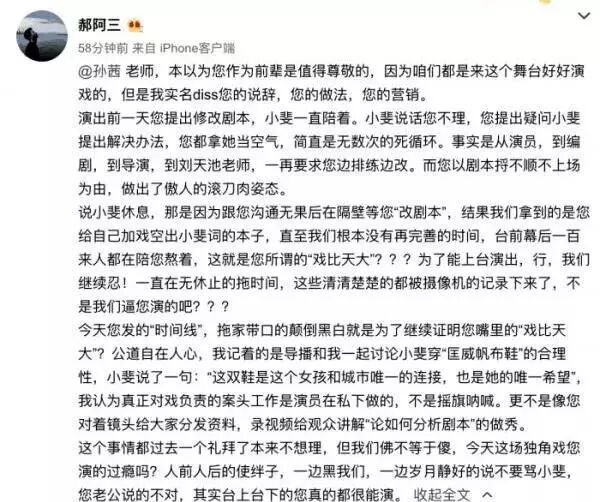 第三集中,孙茜因为自己捋戏导致排练时间减少,两人表演过程中明显看出磨合不够,效果大打折扣。这之后张小斐经纪人在微博公开抨击。