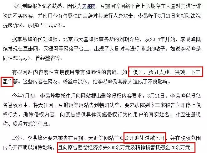 李易峰也曾状告网友使用“丑、猥琐”等侮辱性词汇评价他,并且要求精神损害抚慰金20多万