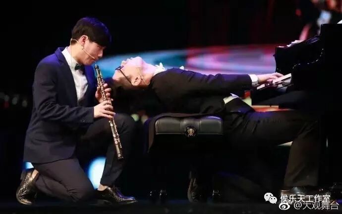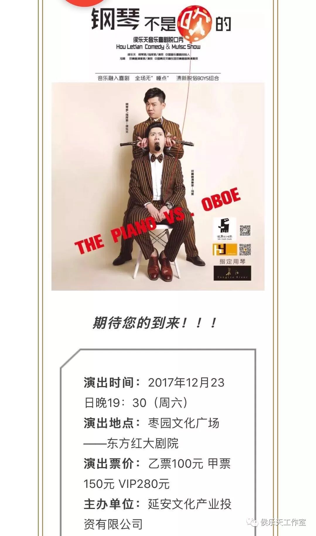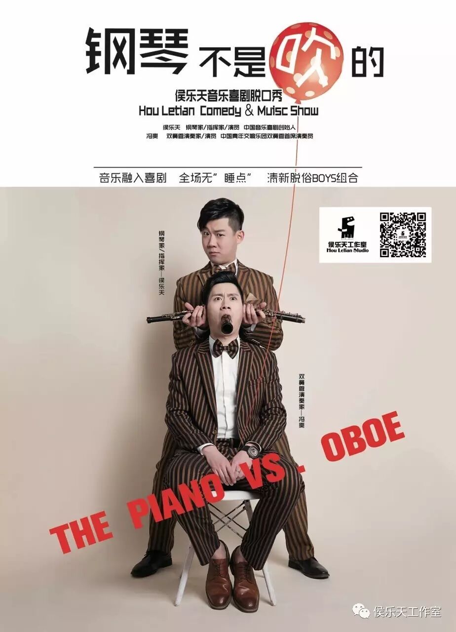 而2017年,我们推出了一个全新的秀,是从头到尾只有我和冯爽两个人共同完成一场90分钟以上的演出,说实话,这比以前的版本要难上数倍,以前起码人多,内容极其多样并且丰富,而现在,两个男人一台戏,只有钢琴与双簧管两种乐器,要想全程抓住观众的注意力,需要我们做极多的准备工作,在剧本的创作上,我们也是熬了无数个大夜,并且真正开发出了一个全新的音乐喜剧节目形式,而这个节目,也的确成为了每场演出中最精彩的高潮段落。由于目前侯乐天音乐喜剧—《钢琴不是吹的》还在巡演当中,所以暂时我们没有放出完整的视频,后面在适当的时间,我们会把一部分视频放出来,奉送给大家!