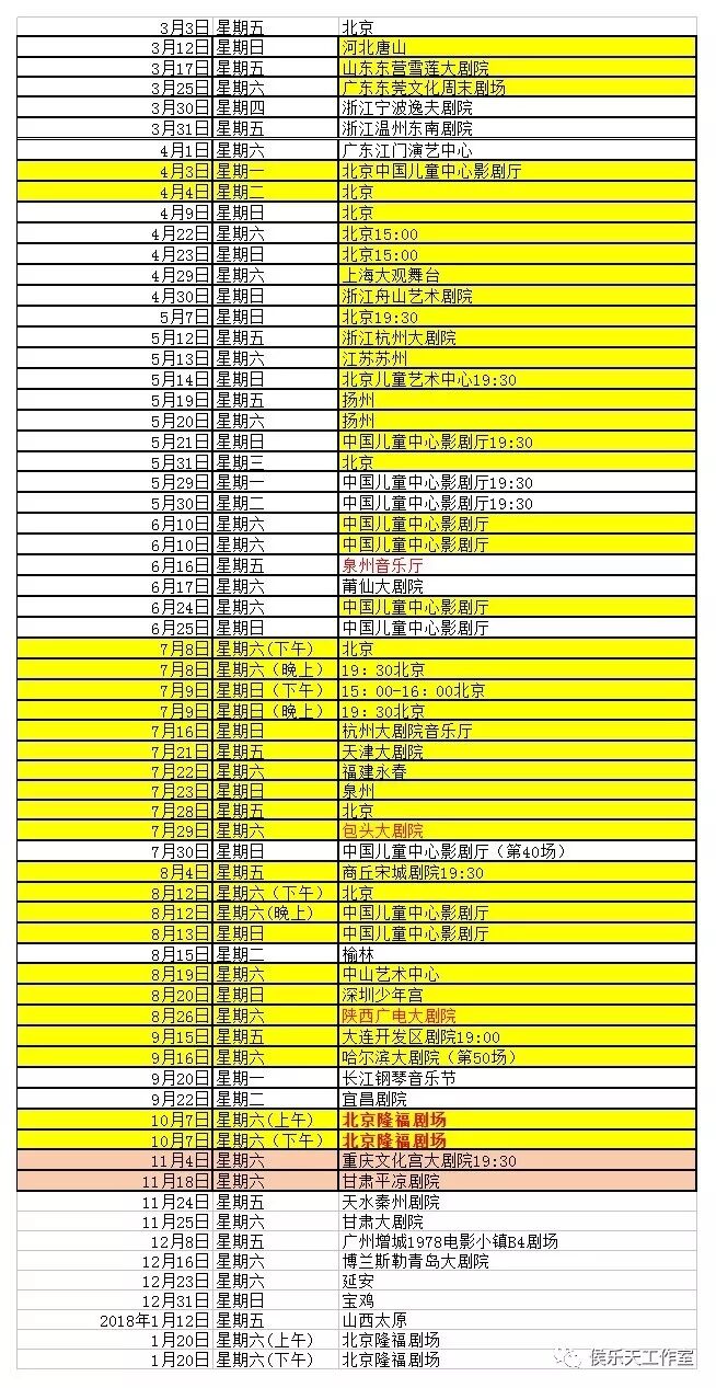 2017年侯乐天音乐喜剧《钢琴不是吹的》演出列表