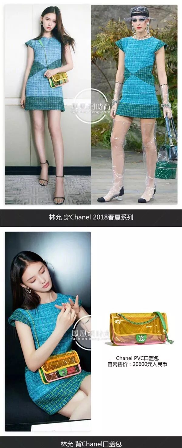 一身蓝绿拼色连衣裙亮相活动现场的她活力满满,以PVC材质的链条包搭配整体造型真的超时髦~