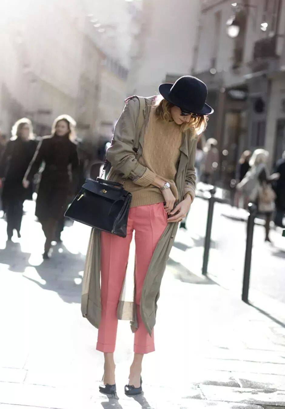 将针织衫单品扎进裤腰,腰部以后全是裤,精致小巧,轻熟知性。
