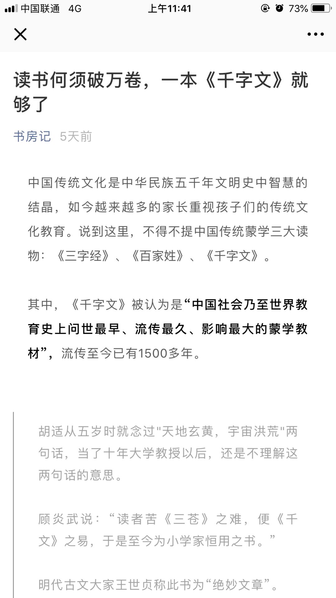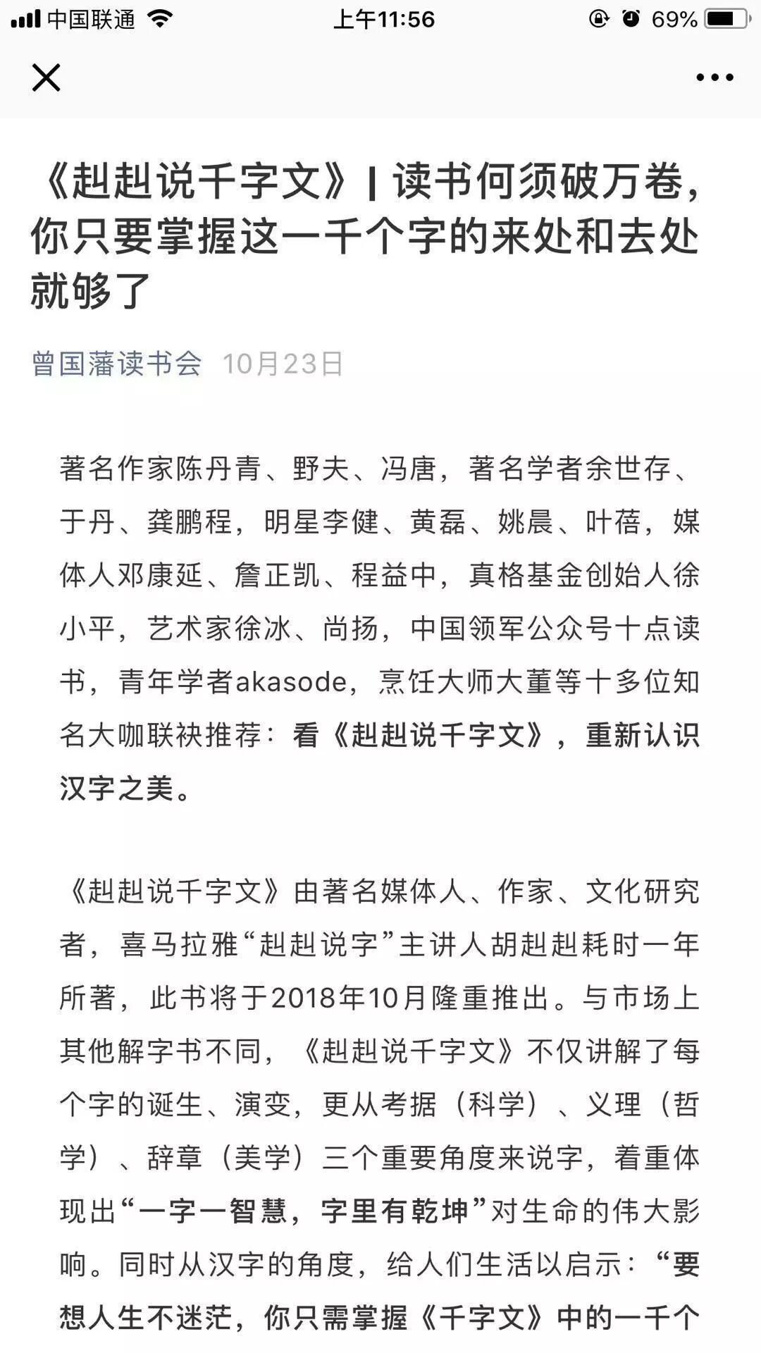 《赳赳说千字文》以《千字文》为范本,从字的字根延展开来,讲述字的本义,造字的故事,和汉字的智慧。而胡赳赳老师认为,《千字文》是最适合进行讲解的范本,因为《千字文》全文共250句,1000个汉字,单字不重复,四字可成句,两组一韵,前后贯通,千字可成文,对仗工整,易诵易记,调理清晰,文采斐然。不仅是儿童启蒙读物,更是一部中国乃至世界教育史上问世最早、流传最久、影响最大的蒙学教材。也正因此,作家野夫才会有“平生不识千字文,纵是英雄也枉然”的感慨。
