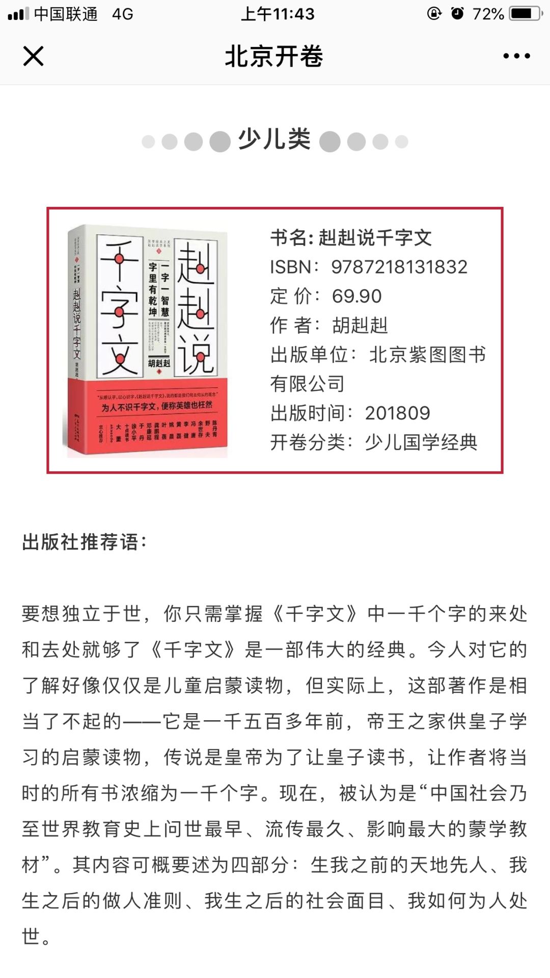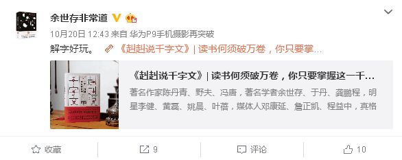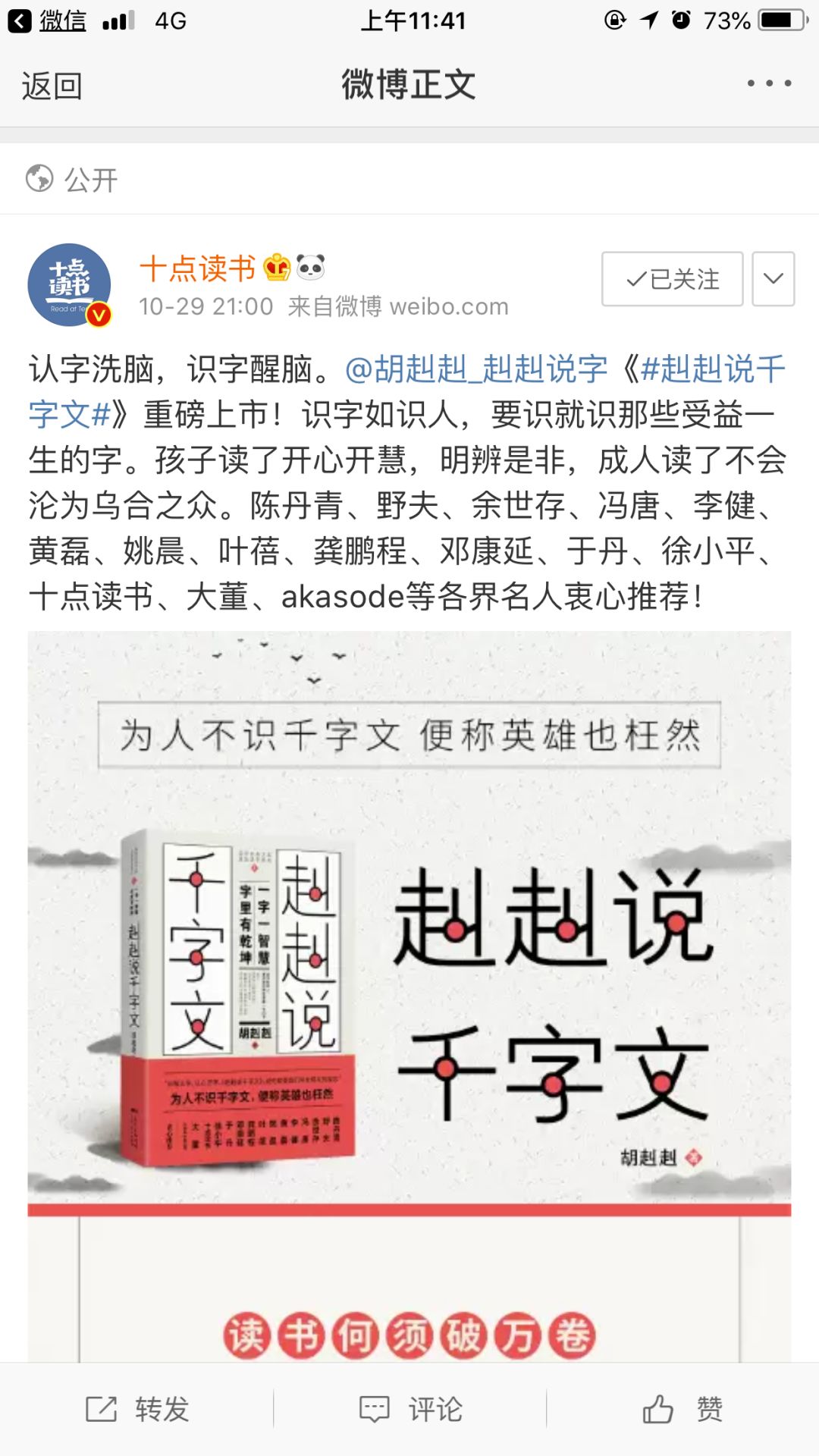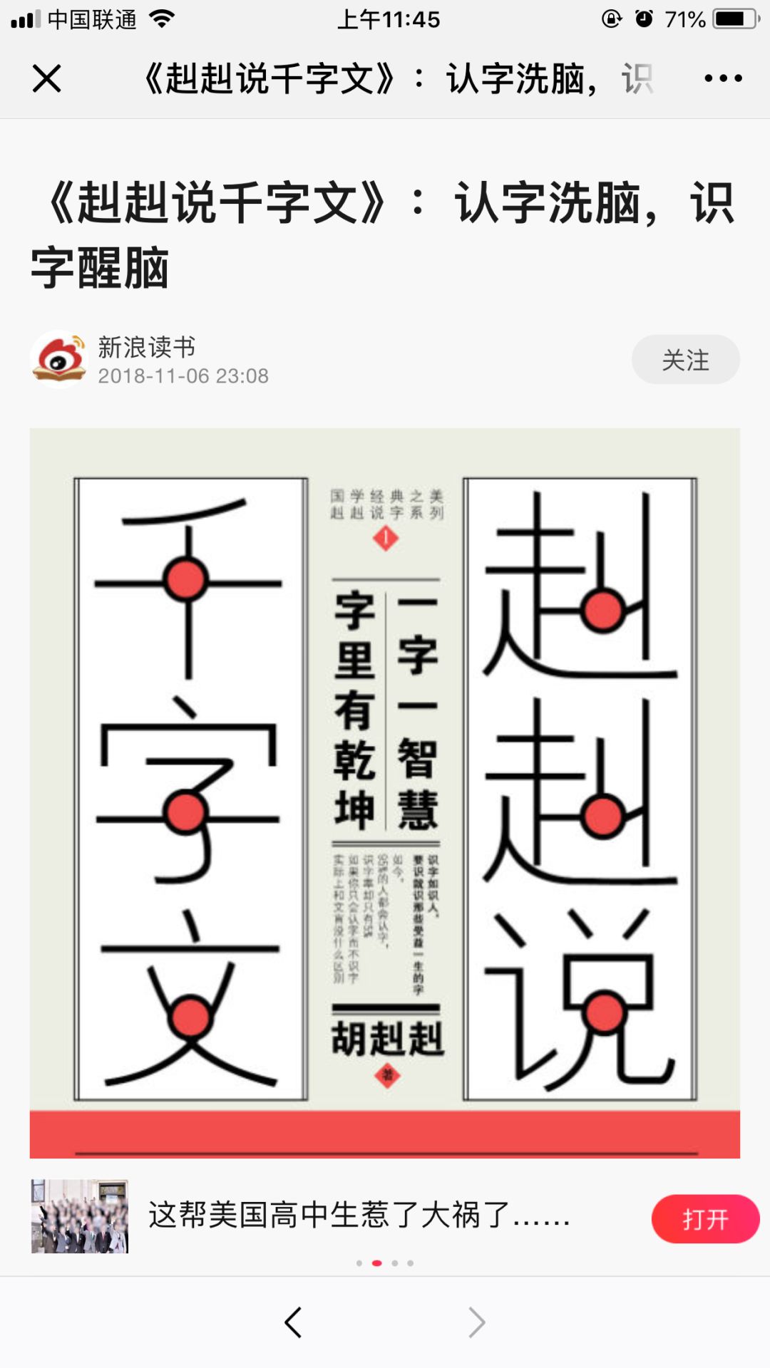 《赳赳说千字文》于2018年10月初上市,自问世以来,受到读者和媒体的广泛关注,话题持续升温,引发了关于“识字”“认字”的思考。与市场上其他解字的书不同,本书不仅讲解了每个字的诞生、演变,更从考据(科学)、义理(哲学)、辞章(美学)三个重要角度来说字,着重体现出“一字一智慧,字里有乾坤”对生命的伟大影响,“要想人生不迷茫,你只需掌握《赳赳说千字文》中的一千个字的来处和去处就够了” ,堪称是一部成人和孩子都能开卷有益的识字百科。