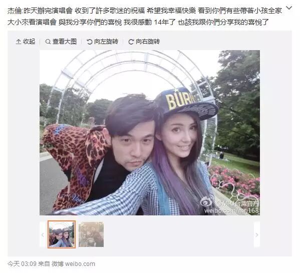 2014年11月17日,周杰伦透过官微晒出与昆凌合照“分享喜悦”。