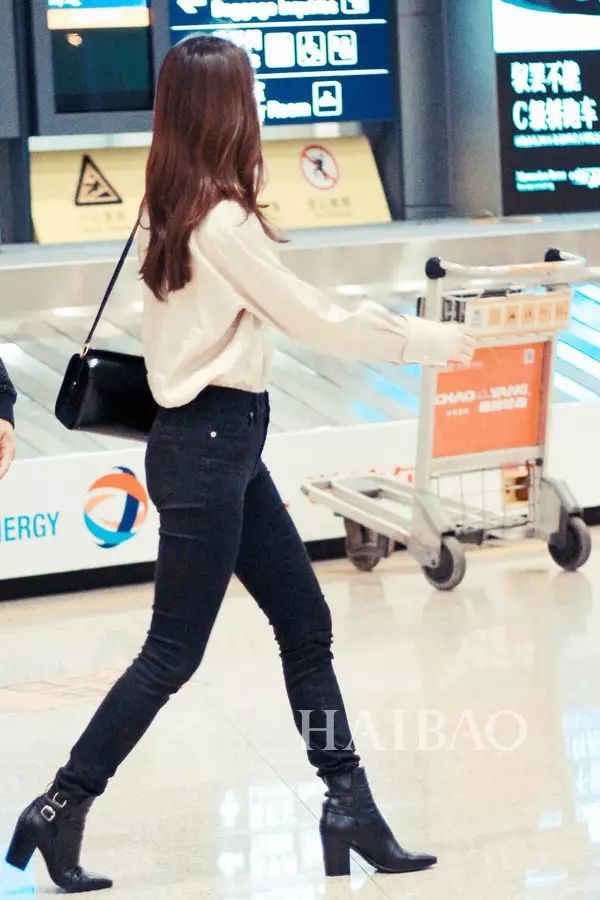 紧身牛仔裤配Saint Laurent别扣短靴,再背一款卖到脱销的Celine手袋,三件黑色基础单品简约组合,再以Margaret Howell光滑面料衬衫点睛提亮,冷淡的极简Look搭上水晶的纤瘦身形与酷酷臭脸,很绝配!