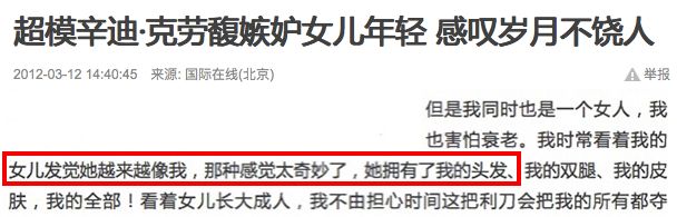 国际超模辛迪·克劳馥接受采访时,承认羡慕女儿的年轻,最明显的特征就是头发。
