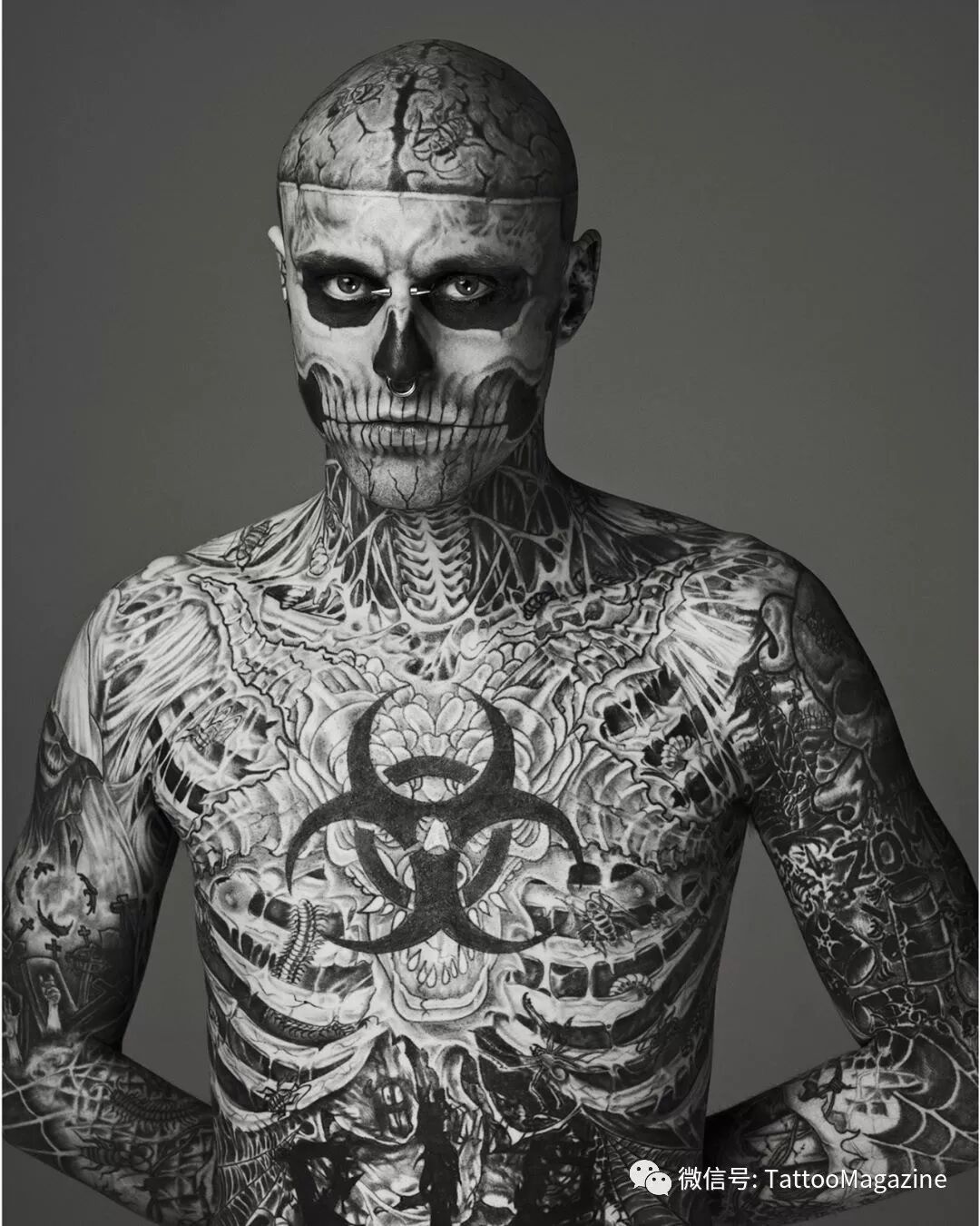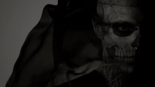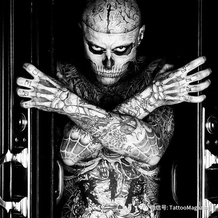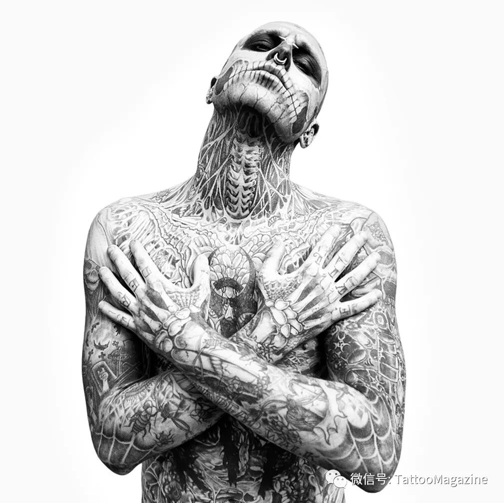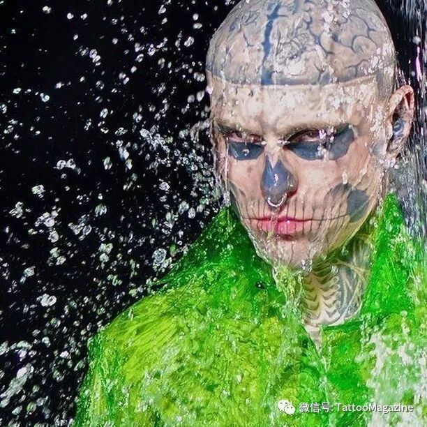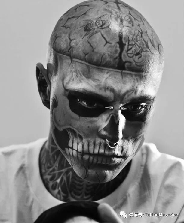 1985年出生的Rick Genest,在加拿大魁北克的蒙特利爾市郊長大。15歲時發現罹患腦瘤,有可能活不久甚至毀容。但他也發現生命太過短暫,想要好好把握,便在在16歲的時候他刺下了人生的第壹個紋身,左肩處的壹個骷髏頭和十字交叉的骨頭圖案。