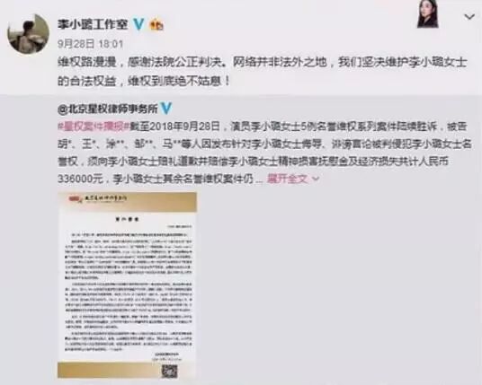 根据网络媒体透露,李小璐一事件已经通过某律师所判定,演员李小璐女士五例名誉维权系列案件陆续胜诉,涉事人员需向李小璐女士赔礼道歉并赔偿李小璐精神损害抚慰金及经济损失共计336000元。