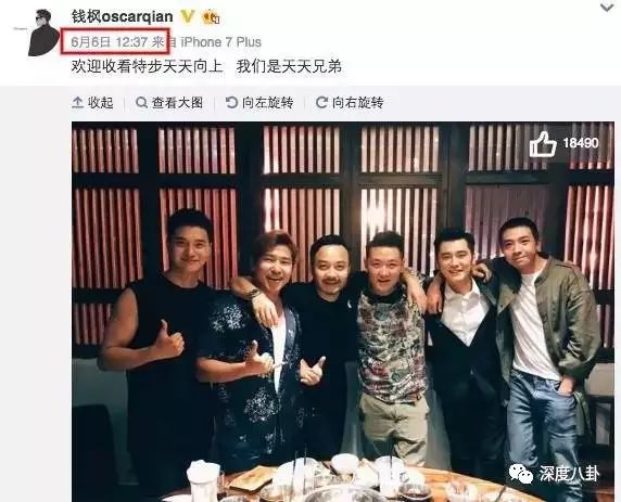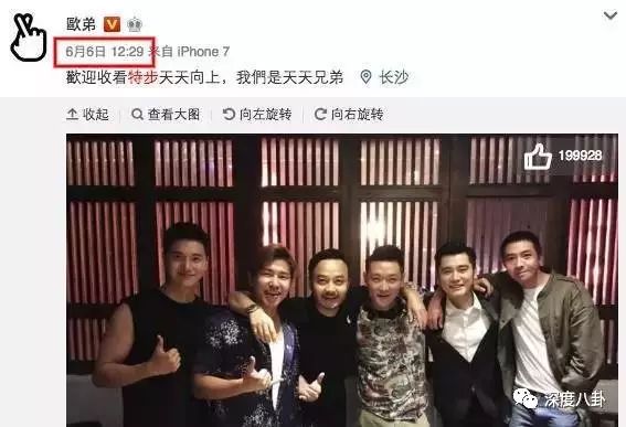 欧弟、钱枫、田源、俞灏明等人在6月6日中午12点半左右时,发了一样的微博,“欢迎收看X步天天向上,我們是天天兄弟 ! ”,还都配上了一起聚餐的照片,照片中还有汪涵、小五,说明这一天中午他们在一起吃了饭。
