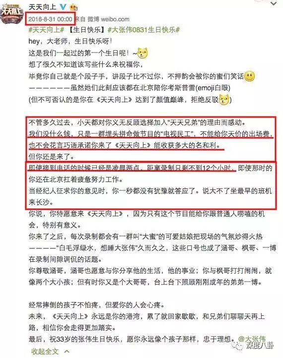 几个月后恰逢大张伟生日,《天天向上》官微在零点送上了生日祝福,并称,“我们没什么钱,只是一群埋头拼命做节目的“电视民工”,不能给你天价的出场费,也不会花言巧语承诺你来了《天天向上》能收获多大的名和利”,“即使接到电话的时候已经是凌晨两点,距离录制只剩不到12个小时,即使那时的你还在北京扛着疲惫努力工作”,“当经纪人征求你的意见时,你一秒都没有犹豫就答应了。说大不了坐最早的班机来长沙”。