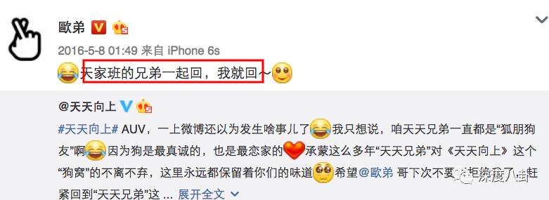 而《天天向上》的官微则大方回应“老狗论”,发文称“承蒙这么多年“天天兄弟”对《天天向上》这个“狗窝”的不离不弃,这里永远都保留着你们的味道”,并且@欧弟,“哥下次不要再拒绝我了,赶紧回到“天天兄弟”这个大家庭里来吧”,暗示是欧弟自己不愿意回来,节目一直为他敞开大门。