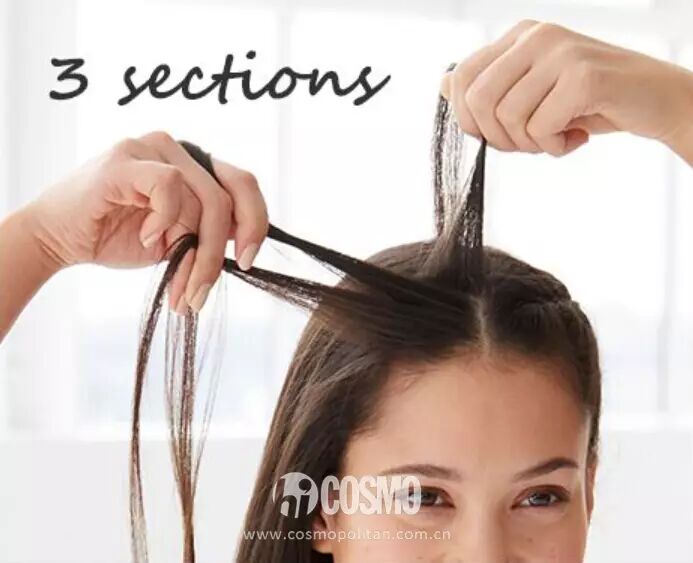 STEP1:首先将头发分成三束,注意是要从头顶开始编。发量是慢慢增加的,这样才会有层次感。