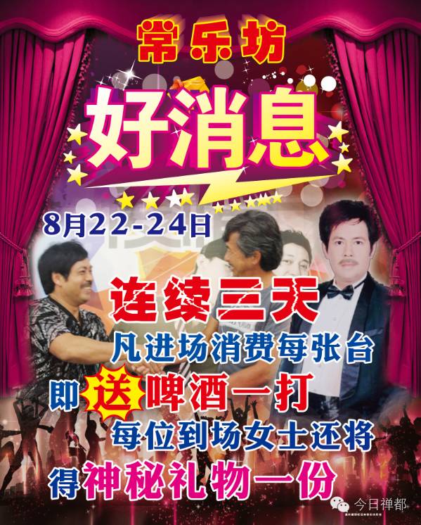 从八月二十二到八月二十四号(连续三晚),入场消费即送啤酒一打。