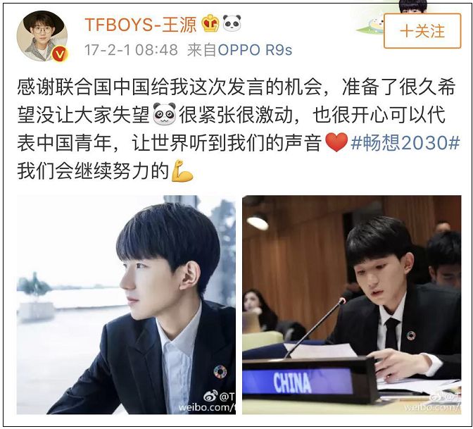 2017、2018年曾参加联合国经济及社会理事会青年论坛并英文议程演讲,是第一位受邀联合国青年论坛的中国艺人,也是首位登上联合国世界舞台的中国少年偶像。