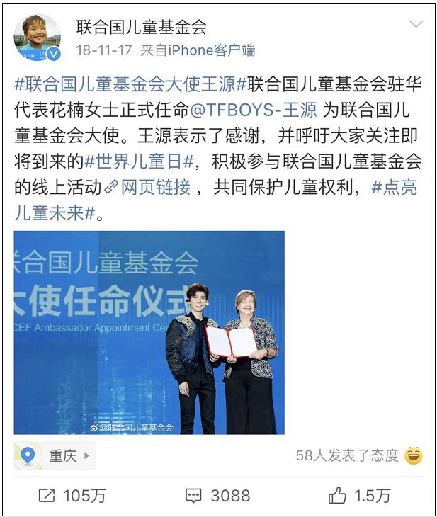 2017年出任“联合国儿童基金会青年教育使者” ;2018年出任“联合国儿童基金会大使” 。