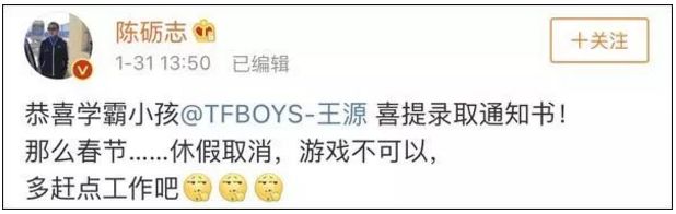 2019年1月31日下午,北京麦特文化娱乐传媒公司董事长兼CEO@陈砺志 微博发文透露@TFBOYS-王源 已被伯克利音乐学院录取。