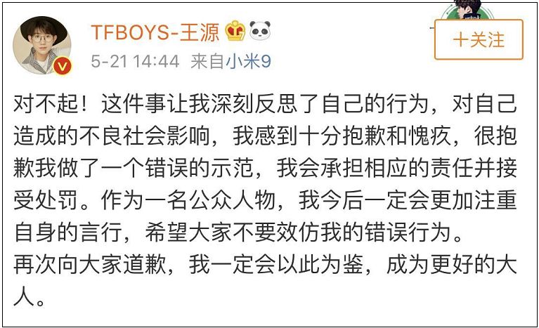 “对不起!这件事让我深刻反思了自己的行为,对自己造成的不良社会影响,我感到十分抱歉和愧疚,很抱歉我做了一个错误的示范,我会承担相应的责任并接受处罚。作为一名公众人物,我今后一定会更加注重自身的言行,希望大家不要效仿我的错误行为。再次向大家道歉,我一定会以此为鉴,成为更好的大人。”