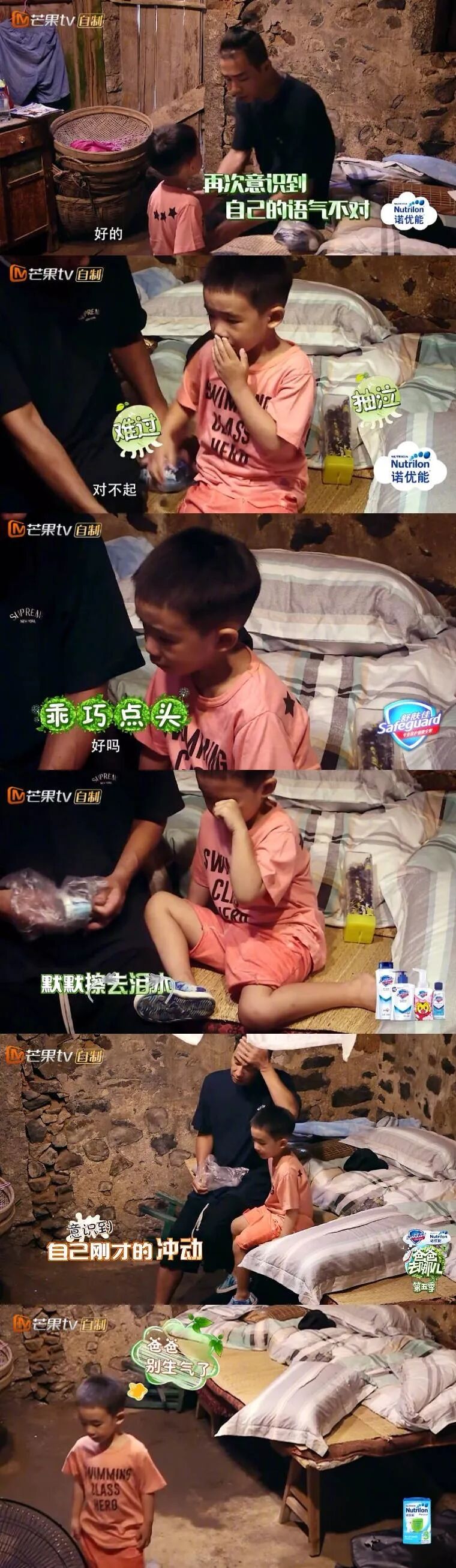 那天和Jasper在节目里说爹地是一个「坏人」,是因为那是第一天录节目,我凶了他很多次,后来换了睡衣在房间里要睡觉了,哄他,我那么想,就那么讲了。我是觉得让他受委屈了,就我讲话比较凶一点嘛,也没有多大想法,我就呆呆地想要跟他聊聊天,没有要说一句什么特别的对白,也没有很复杂地想要去语重心长地讲什么,就想他可以好好睡觉,我讲一句「Sorry」,一些枕头话。