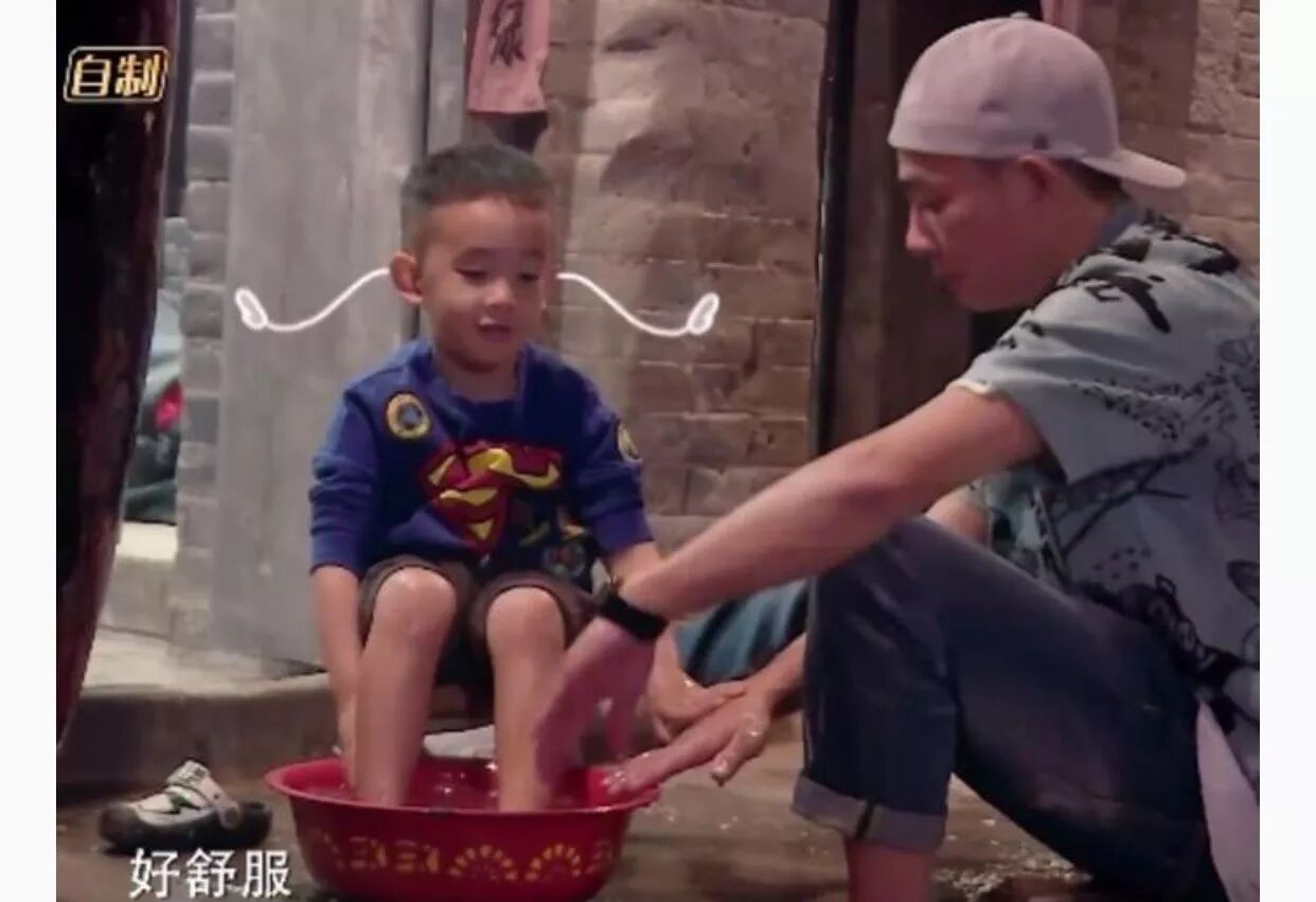 爸爸给他「乱弄」出一盆热水让他泡脚,他无限满足地,「好舒服,你怎么弄的……」后来不小心一脚踩到盆外面的地上,生怕爸爸生气一脸害怕和委屈。