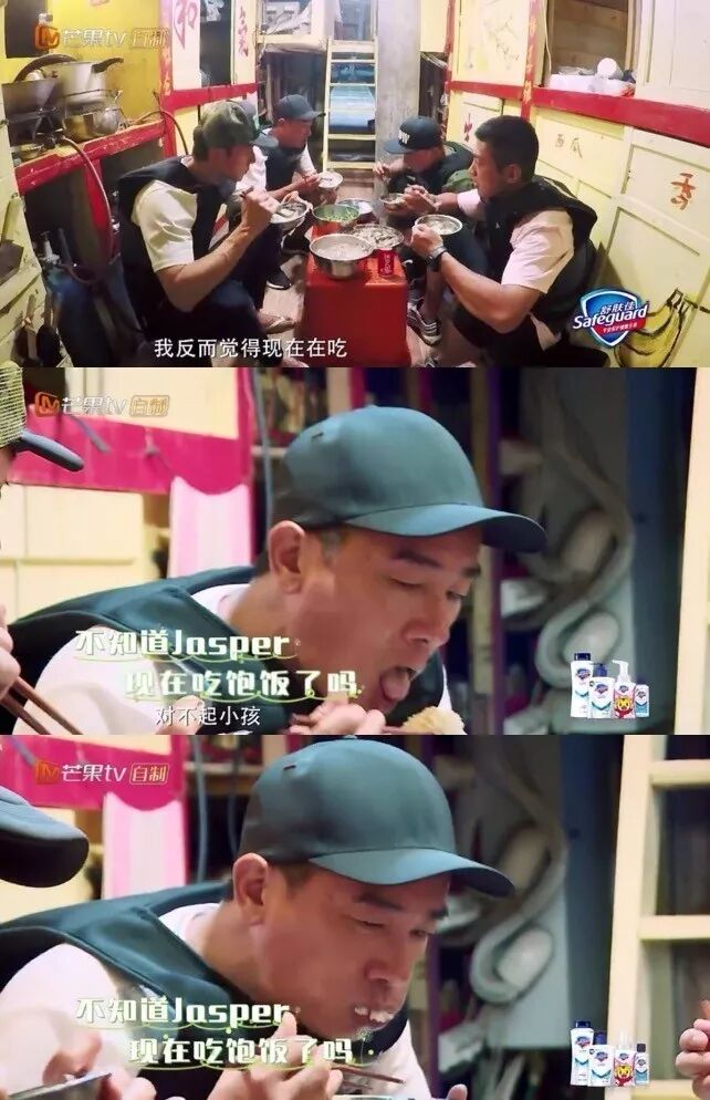 节目中不太懂得表达的陈小春刚说完「觉得吃饭对不起小孩」,就往自己嘴里塞满了一大口饭