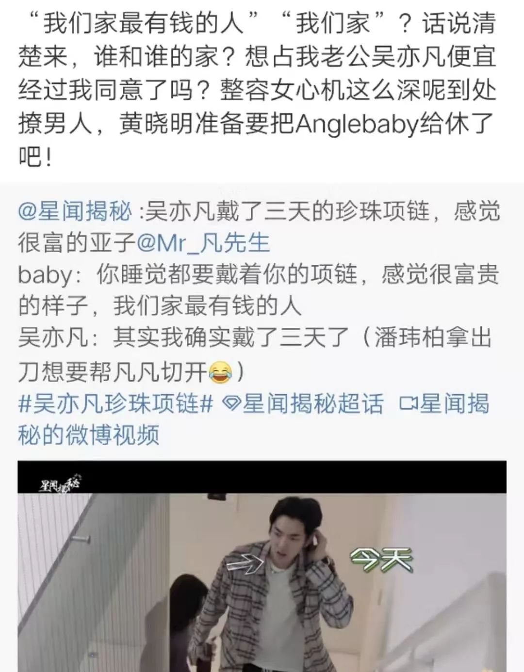 可是这其乐融融的局面到日前也要终结了,由于baby在节目中说吴亦凡是自己家最有钱的人,所以当下吴亦凡粉丝已经开始对baby发难,称其已经是有家有口的人,竟然还有脸去说和吴亦凡是一家人,简直是不知所谓,而baby粉丝这边也马上不甘示弱,说自己家偶像眼睛也没瞎,怎么样也不可能喜欢贵圈的新晋“肥姨”吴亦凡,随着双方这一来二去的,当下坊间也开始有瓜众添油加醋地爆料,说baby已经与黄教主撕破脸,所以才会在综艺里对吴亦凡暗送秋波。