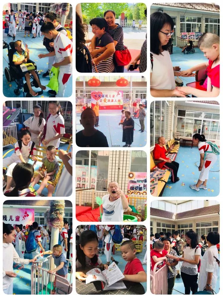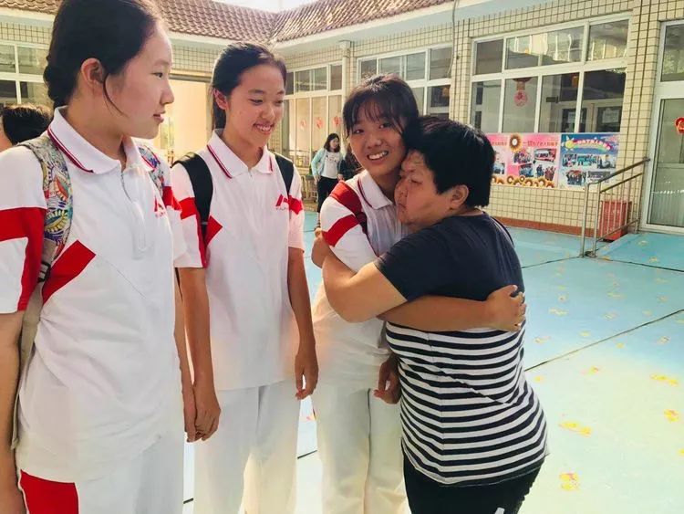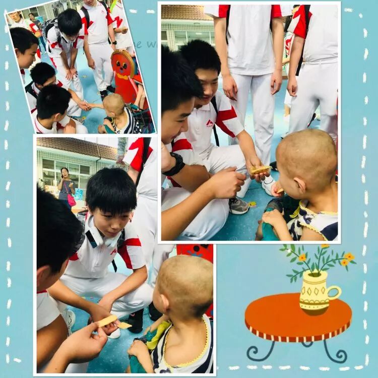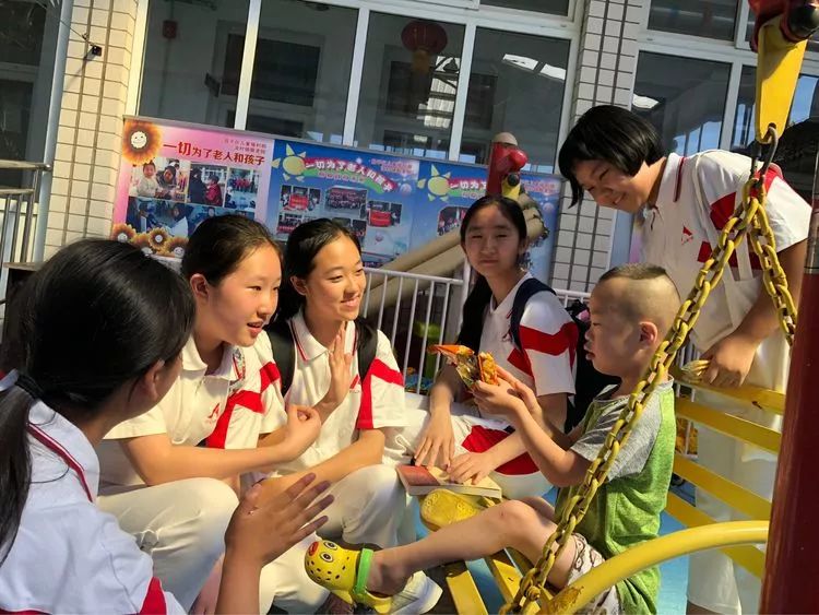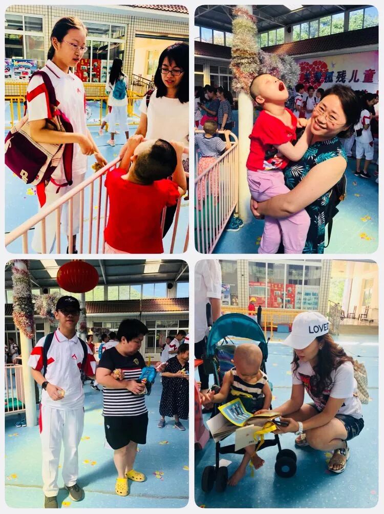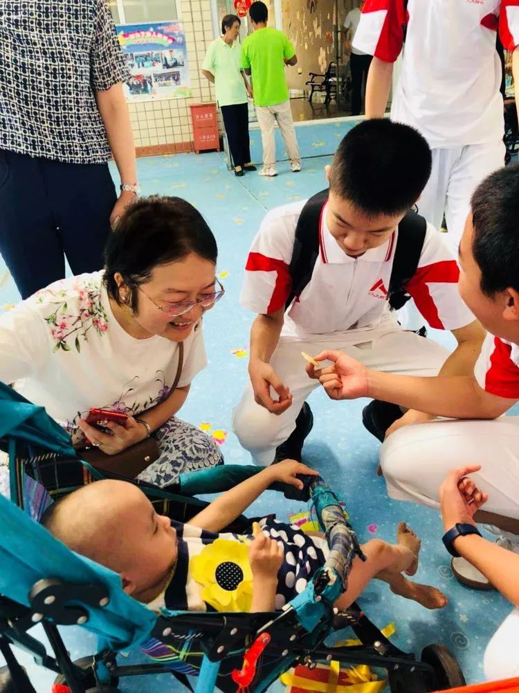 其它家长们也开始走近这些孩子,或抱或牵手或陪伴聊天,有的妈妈已经流下了怜惜的泪水。同学们看到这种情况慢慢的有了放松,在十多分钟不在状态的怔愣后,同学们慢慢恢复过来。在家长的带领下,他们开始一小波一小波近距离接触这些新的“朋友”。他们慢慢找到了与这些孩子相处的方式。他们身上的善良和爱心让他们很快打破了与这个未知世界的界限。有的同学拿出准备好的书籍送给这里有需要的孩子;有的同学拿出随身携带的各种小零食给到喜欢它们的大人或孩子;一位同学带着欣喜地说:我发现她们更喜欢吃的。说这话的时候我想他一定庆幸这是最有意义的一次携带零食。还有的同学和家长一起围着孩子们聊天。