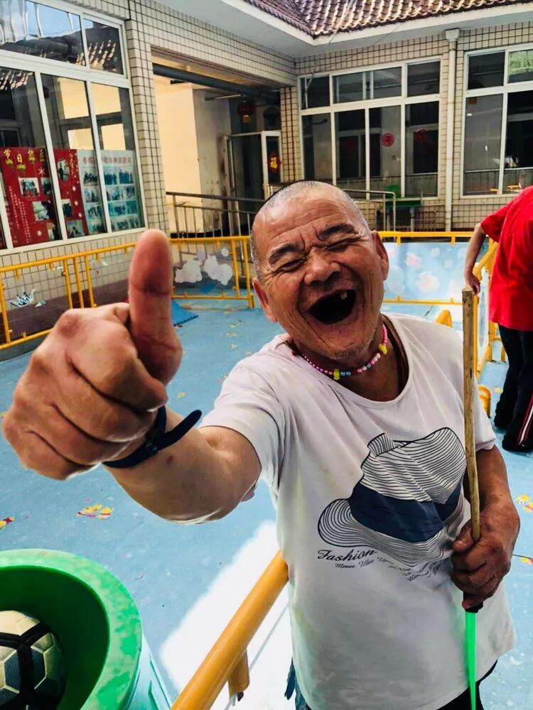 就是这位大爷,他脑瘫很多年了,康复的还不错。他最高兴的一件事情是看见自己的照片在院里的宣传墙上出现,虽然他也不能说话,但是他喜欢告诉每一位来到院里的人他在照片上。这种本能的对存在感的期望让我们热泪盈眶。照片上的他开心的大笑,伸出一个大拇指做出骄傲的姿势。他反复指着照片然后对我伸出大拇指,仿佛告诉我这是他,这就是他,他很棒!是的,我们都认为他很棒!