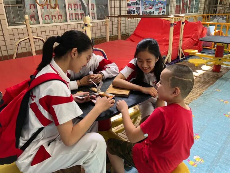 这个小男孩算是这里面为数不多的可以交流的,他其实很聪明。我们的这位女同学一直陪伴他,跟他讲故事,耐心的回应他。后来几个女同学一起加入进来,他们很开心地分享交流。照片中孩子们的脸上都带着毫无隔阂的笑容,我想她们彼此都是温暖的小太阳。